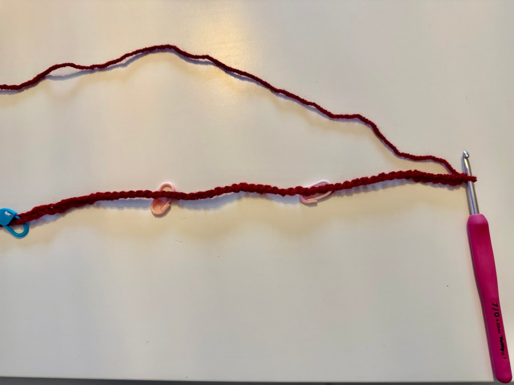 I started by chaining 15 in my chosen colour (claret). At this point I added a stitch marker. I then added a stitch marker every 20 stitches. After placing the 7th stitch marker I chained a further 15 chains.